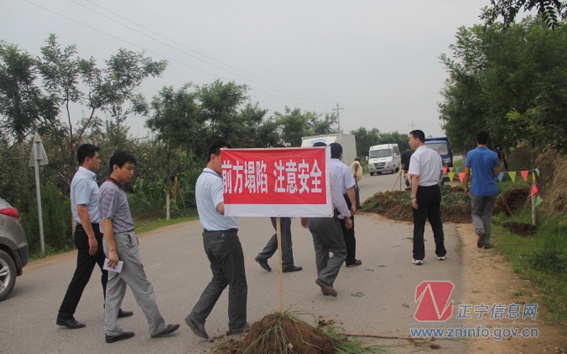 张龙杰一行查看南罗路张村段水毁道路修复情况,再三叮咛工程负责人要保质量保安全保通行。