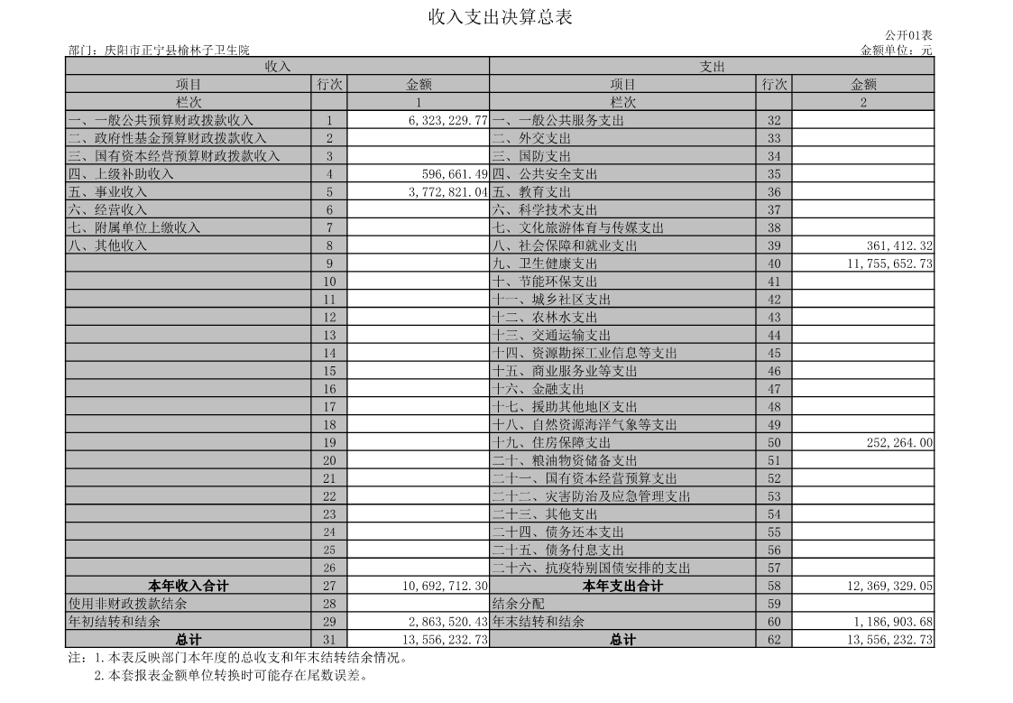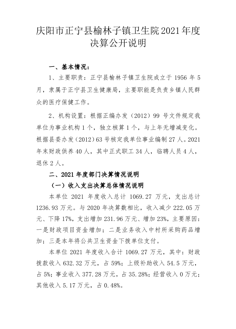 2021年正宁县榆林子镇卫生院决算公开