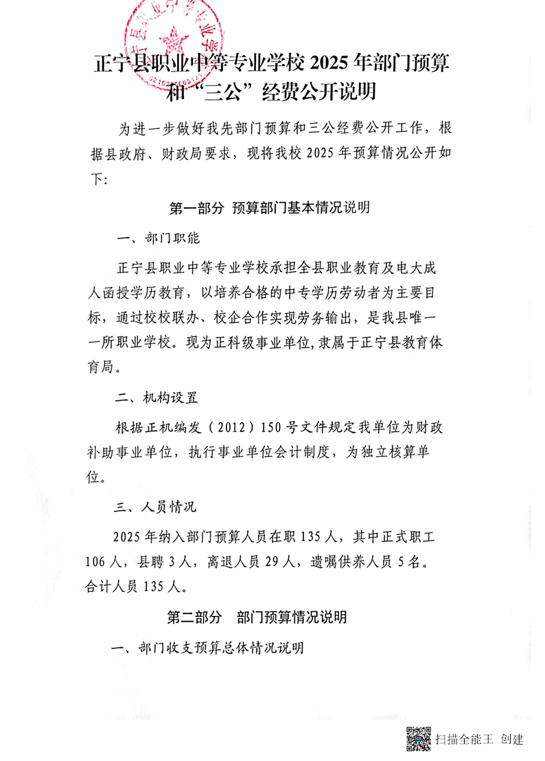 正宁县职业中等专业学校2025年部门预算公开