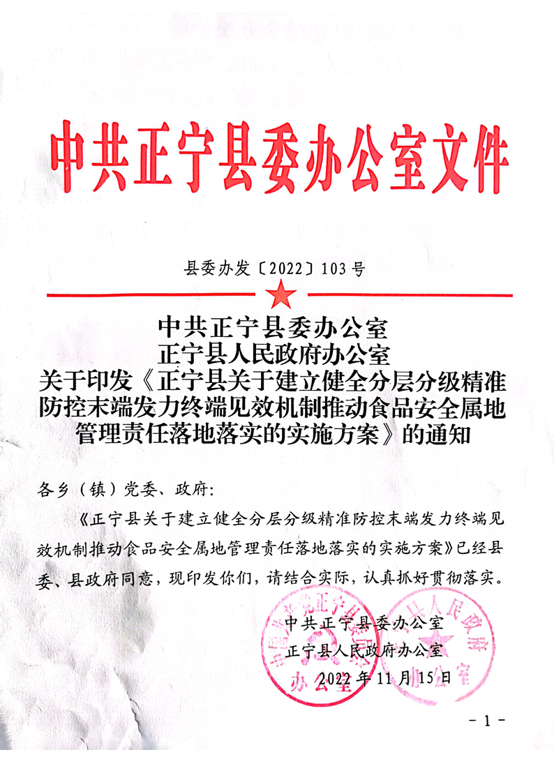 正宁县关于建立健全分层分级精准防控末端发力终端见效机制推动食品安全属地管理责任落地落实的实施方案 来源: 发布时间:2022-12-14 18:05:39 浏览次数: 次 【字体:小 大】 【打印正文】
