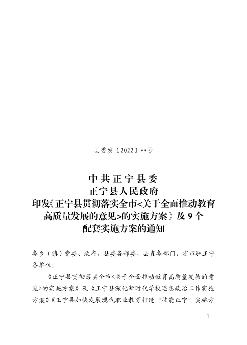 正宁县贯彻落实全市《关于全面推动教育高质量发展的意见》的实施方案