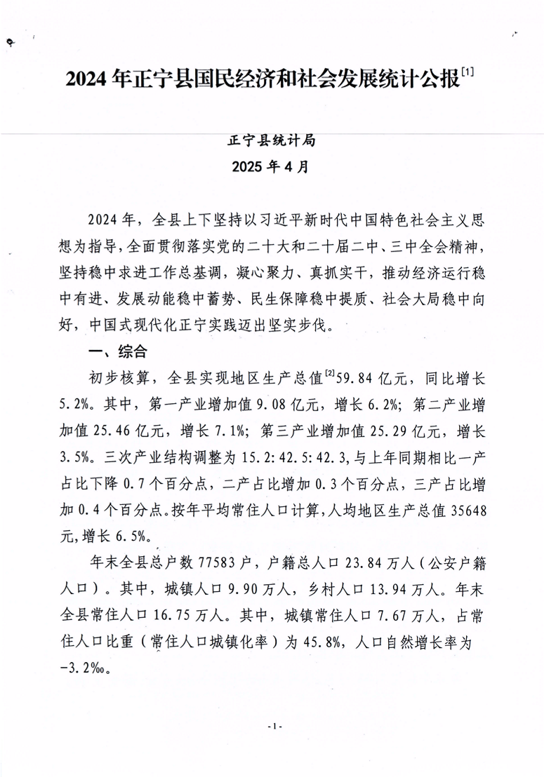索引号: 3070211020000013000000/2025050900000009 发布机构: 生效日期: 2025-04-29 废止日期: 文 号: 所属主题: 统计信息 2024年正宁县国民经济和社会发展统计公报 来源: 发布时间:2025-05-09 浏览次数: 次 【字体:小 大】 【打印正文】 分享到: 【字体:小 大】