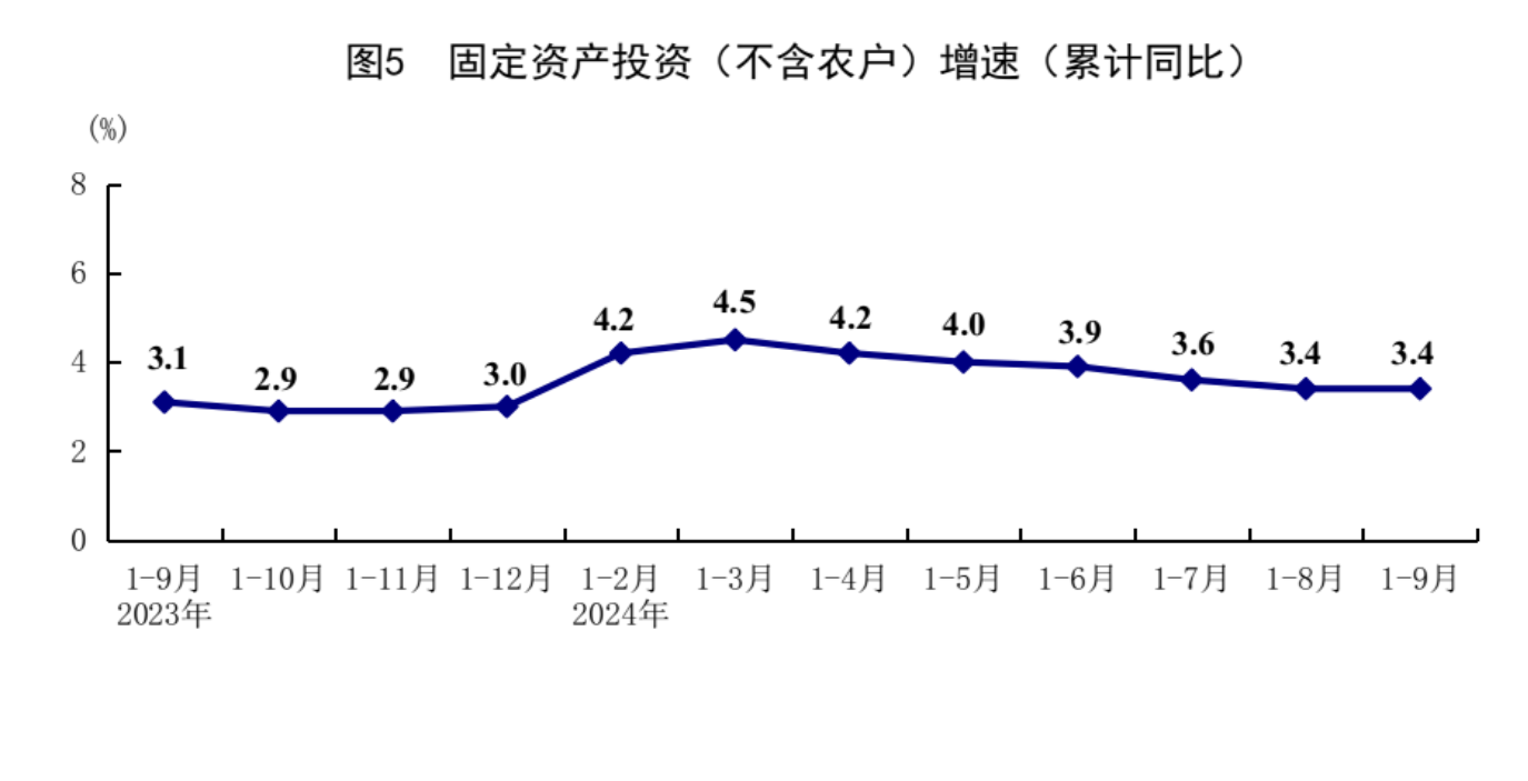 前三季度,全国固定资产投资(不含农户)378978亿元,同比增长3.4%;扣除房地产开发投资,全国固定资产投资增长7.7%。分领域看,基础设施投资同比增长4.1%,制造业投资增长9.2%,房地产开发投资下降10.1%。全国新建商品房销售面积70284万平方米,同比下降17.1%,降幅比上半年和1-8月份分别收窄1.9和0.9个百分点;新建商品房销售额68880亿元,下降22.7%,降幅比上半年和1-8月份分别收窄2.3和0.9个百分点。分产业看,第一产业投资同比增长2.3%,第二产业投资增长12.3%,第三产业投资下降0.7%。民间投资下降0.2%;扣除房地产开发投资,民间投资增长6.4%。高技术产业投资同比增长10.0%,其中高技术制造业和高技术服务业投资分别增长9.4%、11.4%。高技术制造业中,航空、航天器及设备制造业,电子及通信设备制造业投资分别增长34.1%、10.3%;高技术服务业中,专业技术服务业、电子商务服务业、科技成果转化服务业投资分别增长31.8%、14.8%、14.8%。9月份,固定资产投资(不含农户)环比增长0.65%。