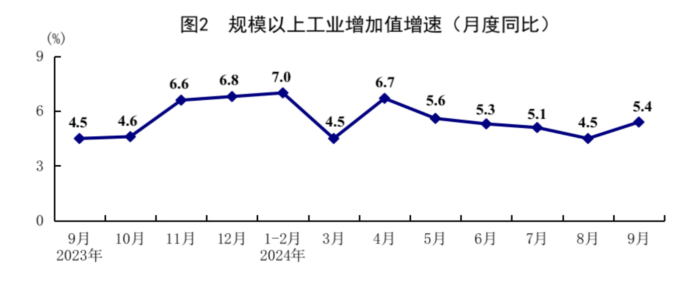前三季度,全国规模以上工业增加值同比增长5.8%。分三大门类看,采矿业增加值同比增长2.9%,制造业增长6.0%,电力、热力、燃气及水生产和供应业增长6.3%。装备制造业增加值同比增长7.5%,高技术制造业增加值增长9.1%,增速分别快于全部规模以上工业1.7和3.3个百分点。分经济类型看,国有控股企业增加值同比增长4.3%;股份制企业增长6.1%,外商及港澳台投资企业增长3.9%;私营企业增长5.5%。分产品看,新能源汽车、集成电路、3D打印设备产品产量同比分别增长33.8%、26.0%、25.4%。9月份,规模以上工业增加值同比增长5.4%,比上月加快0.9个百分点;环比增长0.59%。9月份,制造业采购经理指数为49.8%,比上月上升0.7个百分点;企业生产经营活动预期指数为52.0%。1-8月份,全国规模以上工业企业实现利润总额46527亿元,同比增长0.5%。