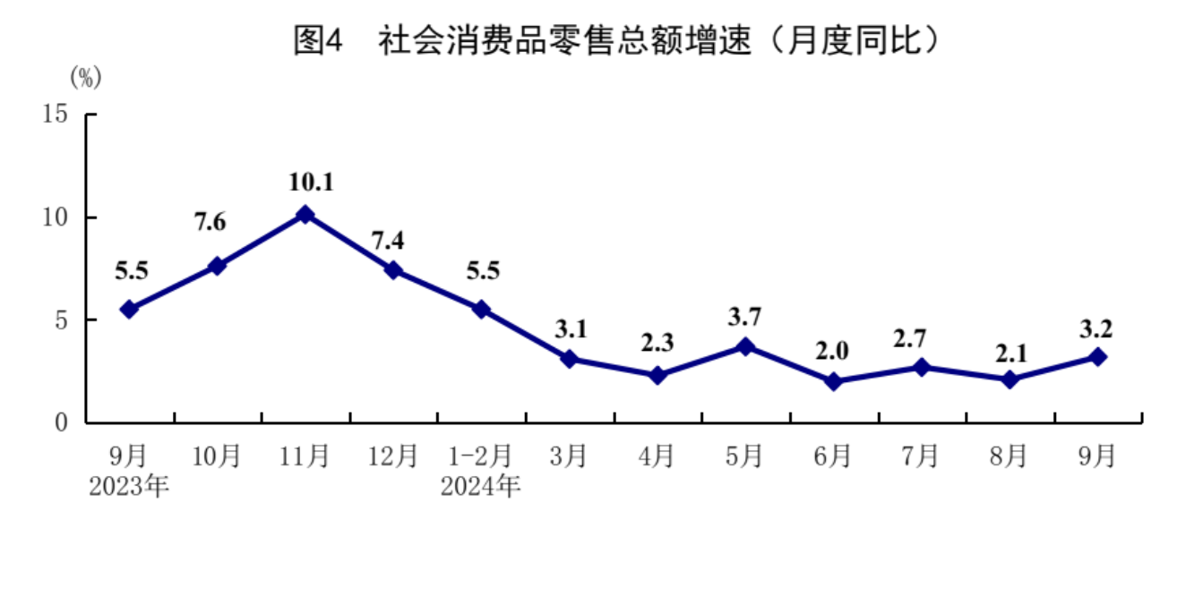 前三季度,社会消费品零售总额353564亿元,同比增长3.3%。按经营单位所在地分,城镇消费品零售额305869亿元,同比增长3.2%;乡村消费品零售额47695亿元,增长4.4%。按消费类型分,商品零售额314149亿元,增长3.0%;餐饮收入39415亿元,增长6.2%。部分基本生活类和升级类商品销售良好,限额以上单位粮油食品类、饮料类商品零售额分别增长9.9%、4.5%;通讯器材类、体育娱乐用品类商品零售额分别增长11.9%、9.7%。全国网上零售额108930亿元,同比增长8.6%。其中,实物商品网上零售额90721亿元,增长7.9%,占社会消费品零售总额的比重为25.7%。9月份,社会消费品零售总额同比增长3.2%,比上月加快1.1个百分点;环比增长0.39%。汽车、家电等商品销售向好,9月份限额以上单位家用电器和音像器材类、通讯器材类、文化办公用品类商品零售额分别增长20.5%、12.3%、10.0%;汽车类、家具类商品零售额均增长0.4%,增速由负转正。前三季度,服务零售额同比增长6.7%。