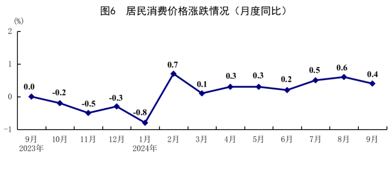 前三季度,全国居民消费价格指数(CPI)同比上涨0.3%,涨幅比上半年扩大0.2个百分点。分类别看,食品烟酒价格下降0.4%,衣着价格上涨1.5%,居住价格上涨0.1%,生活用品及服务价格上涨0.7%,交通通信价格下降1.3%,教育文化娱乐价格上涨1.7%,医疗保健价格上涨1.4%,其他用品及服务价格上涨3.4%。在食品烟酒价格中,鲜果价格下降4.7%,粮食价格上涨0.2%,鲜菜价格上涨3.3%,猪肉价格上涨5.8%。扣除食品和能源价格后的核心CPI同比上涨0.5%。9月份,全国居民消费价格同比上涨0.4%,环比持平。