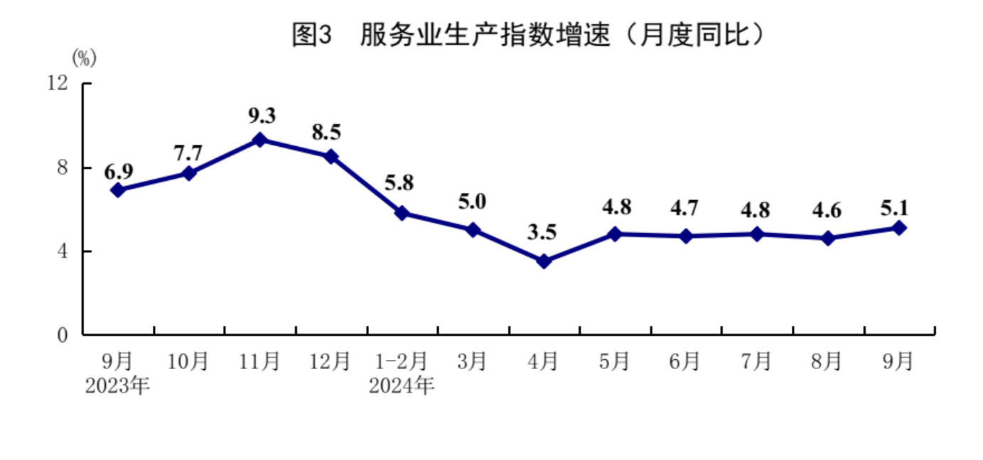 前三季度,服务业增加值同比增长4.7%。其中,信息传输、软件和信息技术服务业,租赁和商务服务业,交通运输、仓储和邮政业,住宿和餐饮业,批发和零售业增加值分别增长11.3%、10.1%、6.8%、6.3%、5.4%。9月份,全国服务业生产指数同比增长5.1%,比上月加快0.5个百分点。其中,信息传输、软件和信息技术服务业,租赁和商务服务业,金融业生产指数分别增长11.4%、9.7%、6.5%。1-8月份,规模以上服务业企业营业收入同比增长7.7%。9月份,服务业商务活动指数为49.9%,服务业业务活动预期指数为54.6%。其中,邮政、电信广播电视及卫星传输服务、互联网软件及信息技术服务、货币金融服务等行业商务活动指数位于55.0%以上较高景气区间。