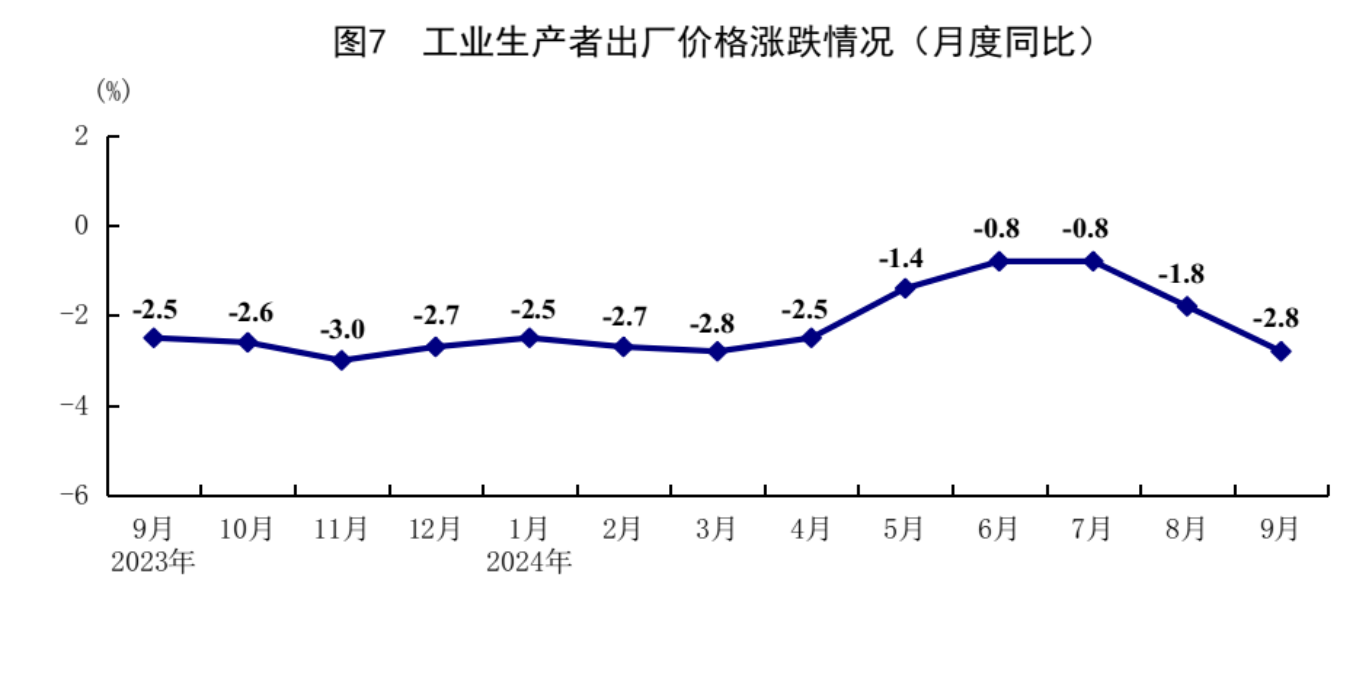 前三季度,全国工业生产者出厂价格同比下降2.0%,降幅比上半年收窄0.1个百分点。其中,9月份同比下降2.8%,环比下降0.6%。前三季度,工业生产者购进价格同比下降2.1%。其中,9月份同比下降2.2%,环比下降0.8%。
