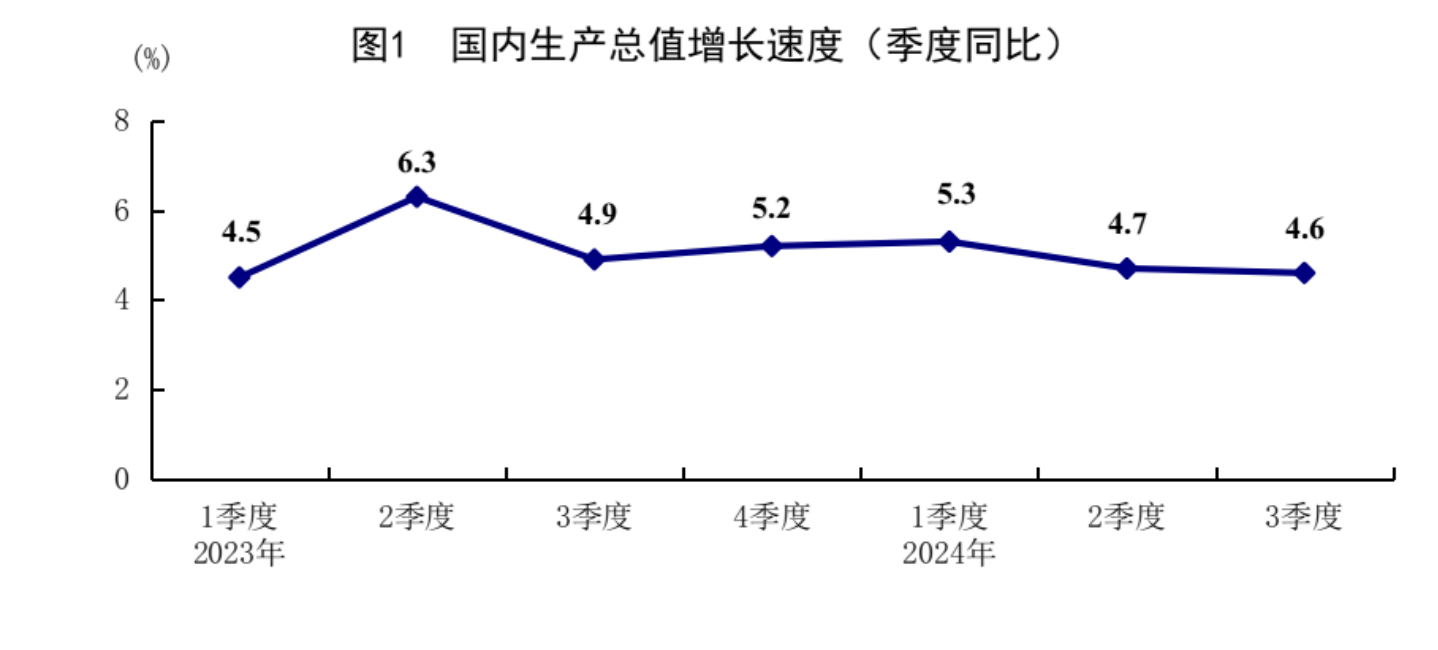 初步核算,前三季度国内生产总值949746亿元,按不变价格计算,同比增长4.8%。分产业看,第一产业增加值57733亿元,同比增长3.4%;第二产业增加值361362亿元,增长5.4%;第三产业增加值530651亿元,增长4.7%。分季度看,一季度国内生产总值同比增长5.3%,二季度增长4.7%,三季度增长4.6%。从环比看,三季度国内生产总值增长0.9%。