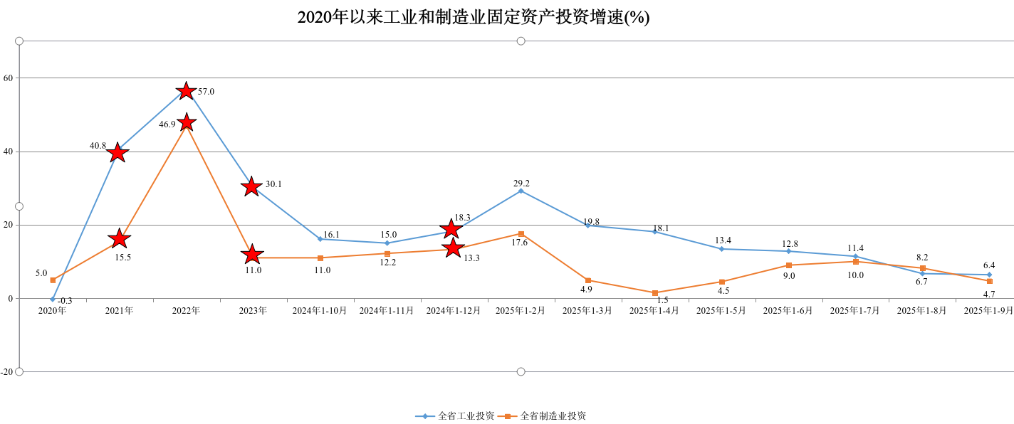 2025年1-9月,全省工业固定资产投资同比增长6.4%,与全国平均水平(6.4%)持平,位居全国第19位,增幅较上年同期回落12.1个百分点,较2025年1-8月回落0.3个百分点。
