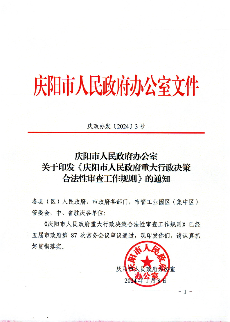 索引号: 3070211020000013000000/2024020100000002 发布机构: 生效日期: 2024-01-19 废止日期: 文 号: 所属主题: 政府文件 庆阳市人民政府办公室关于印发《庆阳市人民政府重大行政决策合法性审查工作规则》的通知 来源:庆阳市人民政府网站 发布时间:2024-01-19 浏览次数: 次 【字体:小 大】 【打印正文】 分享到: 【字体:小 大】