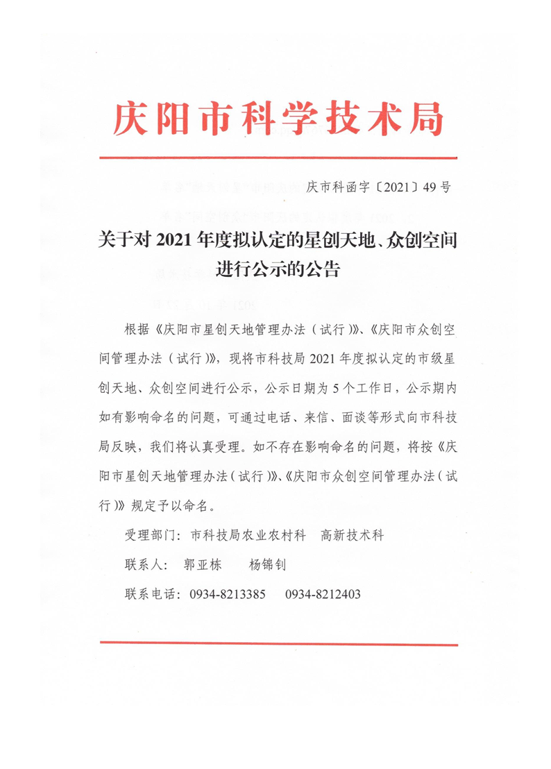 索引号: 3070211020000013000000/2021102500000024 发布机构: 生效日期: 2021-10-25 废止日期: 文 号: 所属主题: 政府文件 关于对2021年度拟认定的星创天地、众创空间进行公示的公告 来源: 发布时间:2021-10-25 浏览次数: 次 【字体:小 大】 【打印正文】 分享到: 【字体:小 大】