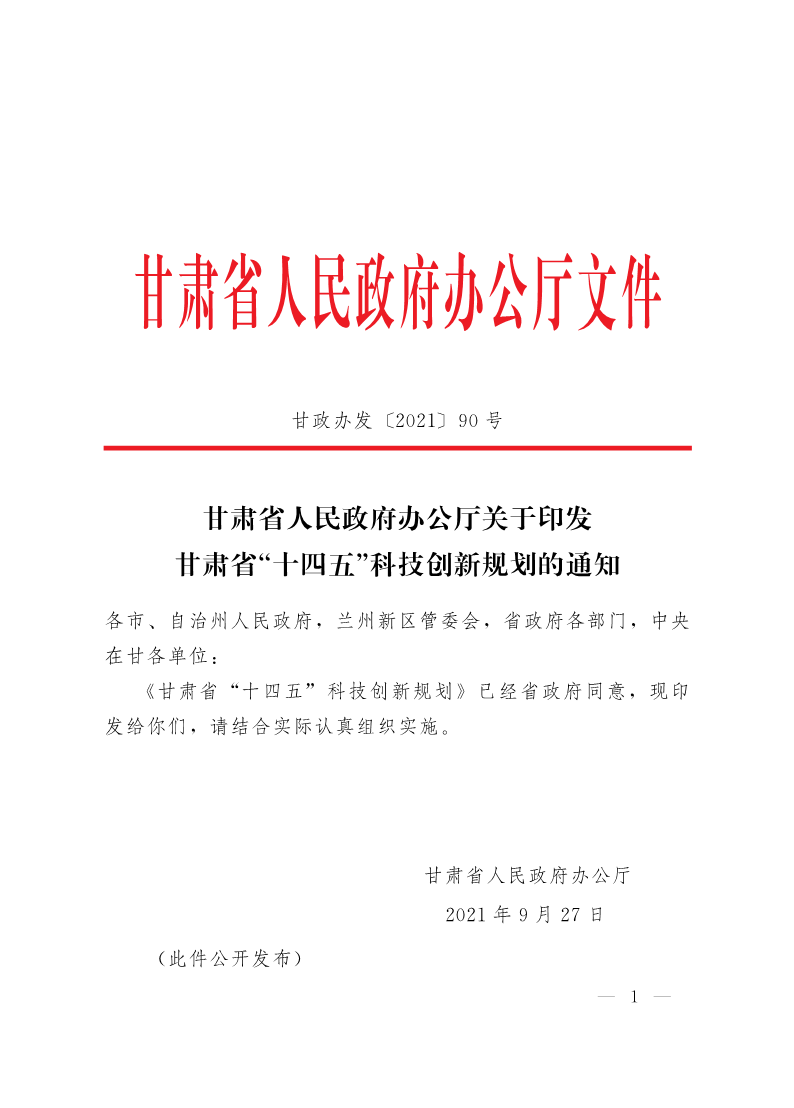 索引号: 3070211020000013000000/2021102700000025 发布机构: 生效日期: 2021-10-27 废止日期: 文 号: 所属主题: 政府文件 甘肃省人民政府办公厅关于印发甘肃省“十四五”科技创新规划的通知 来源: 发布时间:2021-10-27 浏览次数: 次 【字体:小 大】 【打印正文】 分享到: 【字体:小 大】