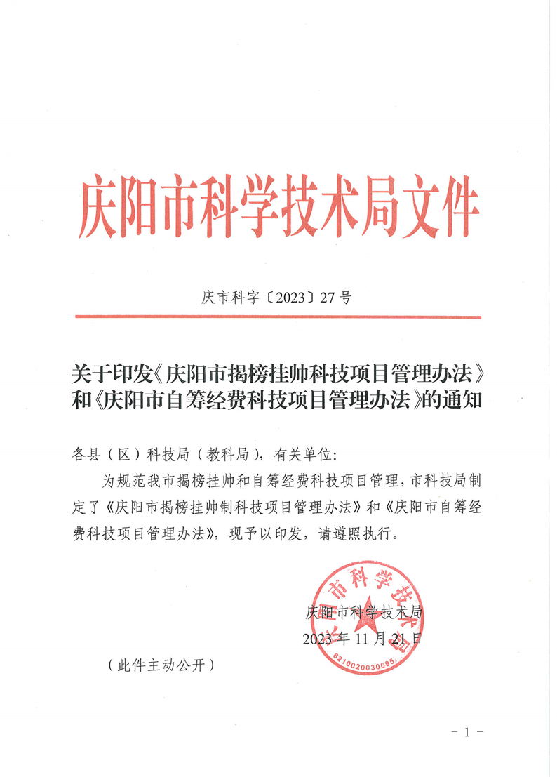 索引号: 3070211020000013000000/2023120500000012 发布机构: 生效日期: 2023-12-05 废止日期: 文 号: 所属主题: 政府文件 关于印发《庆阳市揭榜挂帅科技项目管理办法》 和《庆阳市自筹经费科技项目管理办法》的通知 来源: 发布时间:2023-12-05 浏览次数: 次 【字体:小 大】 【打印正文】 分享到: 【字体:小 大】