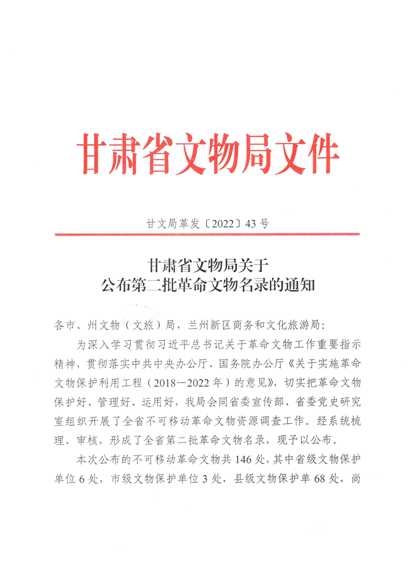 索引号: 3070211020000013000000/2023022300000003 发布机构: 生效日期: 2023-02-23 废止日期: 文 号: 所属主题: 政府文件 甘肃省文物局关于公布第二批革命文物名录的通知 来源: 发布时间:2023-02-23 浏览次数: 次 【字体:小 大】 【打印正文】 分享到: 【字体:小 大】