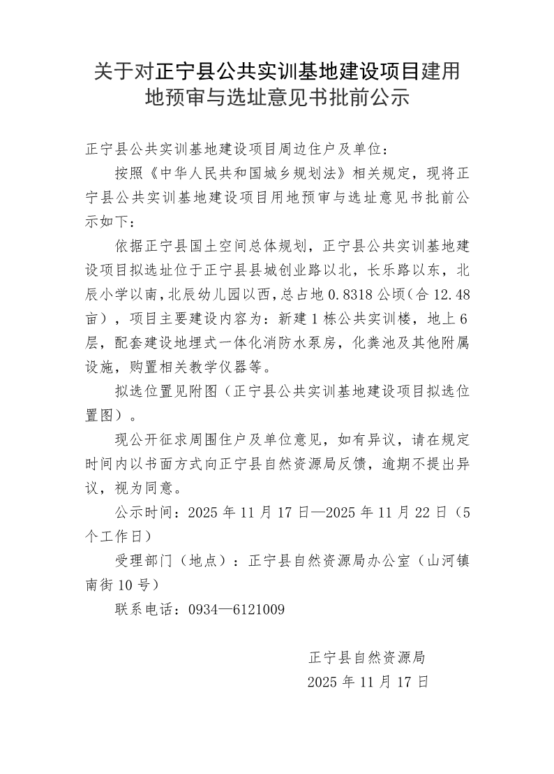 索引号: 3070211020000013000000/2025112000000150 发布机构: 生效日期: 2025-11-17 废止日期: 文 号: 所属主题: 规划信息 关于正宁县公共实训基地建设项目用地预审与选址意见书批前公示 来源: 发布时间:2025-11-17 浏览次数: 次 【字体:小 大】 【打印正文】 分享到: 【字体:小 大】